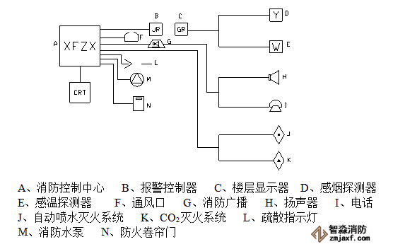 本系統(tǒng)的消防設(shè)施工作原理如圖: