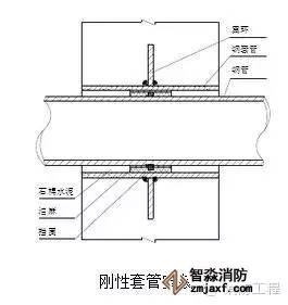 1.剛性套管安裝:主體結(jié)構(gòu)鋼筋綁扎好后,按照給排水施工圖標(biāo)高幾何尺寸找準(zhǔn)位置,然后將套管置于鋼筋中,焊接在鋼筋網(wǎng)中,如果需氣割鋼筋安裝的,安裝后必須用加強筋加固,并做好套管的防堵工作。剛性套管安裝如圖所示:
