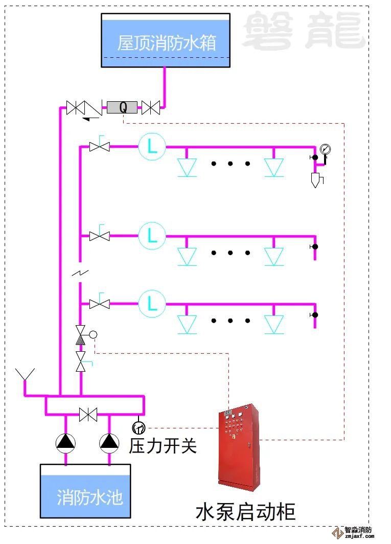 對(duì)于這類(lèi)系統(tǒng),消防水泵出水干管上應(yīng)設(shè)置壓力開(kāi)關(guān),高位消防水箱出水管上應(yīng)設(shè)置流量開(kāi)關(guān),存在問(wèn)題及解決措施: