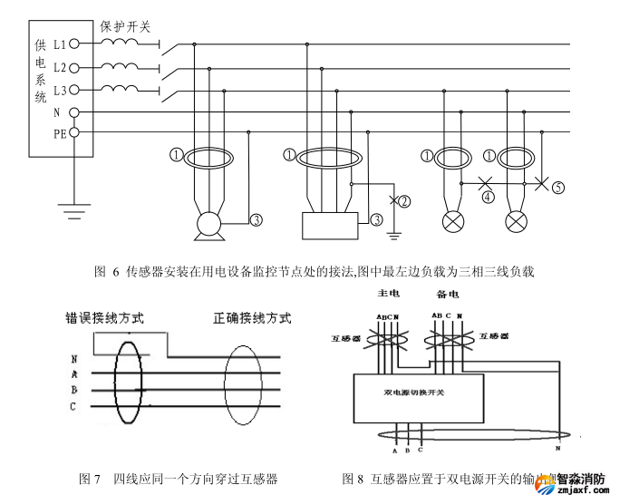 2) 每個(gè)監(jiān)控點(diǎn)處凡不通過(guò)負(fù)荷電流的電纜 PE 或 PEN不得穿過(guò)傳感器,應(yīng)如下圖中標(biāo)③處所示。