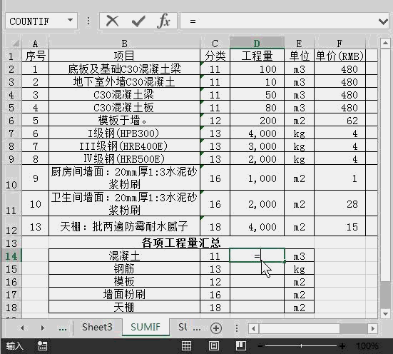 請(qǐng)注意,需要將各項(xiàng)工程量進(jìn)行分類(如11、12……)。筆者再解釋下單元格D14的公式“=SUMIF($C$2:$C$12,C14,$D$2:$D$12)”:第一個(gè)參數(shù)“$C$2:$C$12”和第三個(gè)參數(shù)”$D$2:$D$12“必須保持單元格行數(shù)對(duì)應(yīng)。比如本案例中"分類"列的起始行數(shù)為2,"工程量"列的起始行數(shù)也必須為2。同樣,"分類"列的結(jié)束行數(shù)為12,"工程量"列的結(jié)束行數(shù)也必須為12。另外,這兩個(gè)參數(shù)必須用”$”鎖定單元格,這么做是為了方便后期批量復(fù)制單元格的時(shí)候分類匯總數(shù)據(jù)不會(huì)隨粘貼單元格位置的不同而變化。