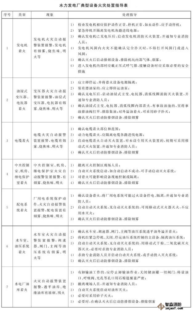 5、水力發(fā)電廠發(fā)生火災(zāi)時(shí),值班人員應(yīng)及時(shí)進(jìn)行火災(zāi)處置并報(bào)警,相關(guān)設(shè)備的火災(zāi)處置參見下表。