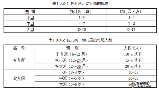 八、托兒所、幼兒園的規(guī)模應符合表1.0.3-1的規(guī)定,托兒所、幼兒園的每班人數(shù)宜符合表1.0.3-2的規(guī)定。(1.0.3)