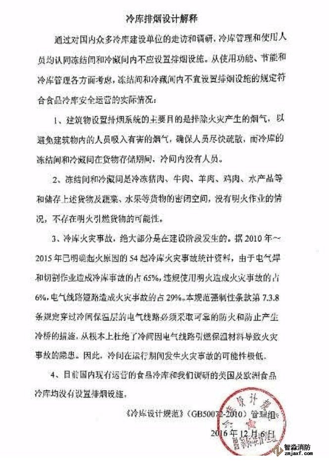《冷庫設(shè)計(jì)規(guī)范》管理組復(fù)函:冷庫排煙設(shè)計(jì)解釋!