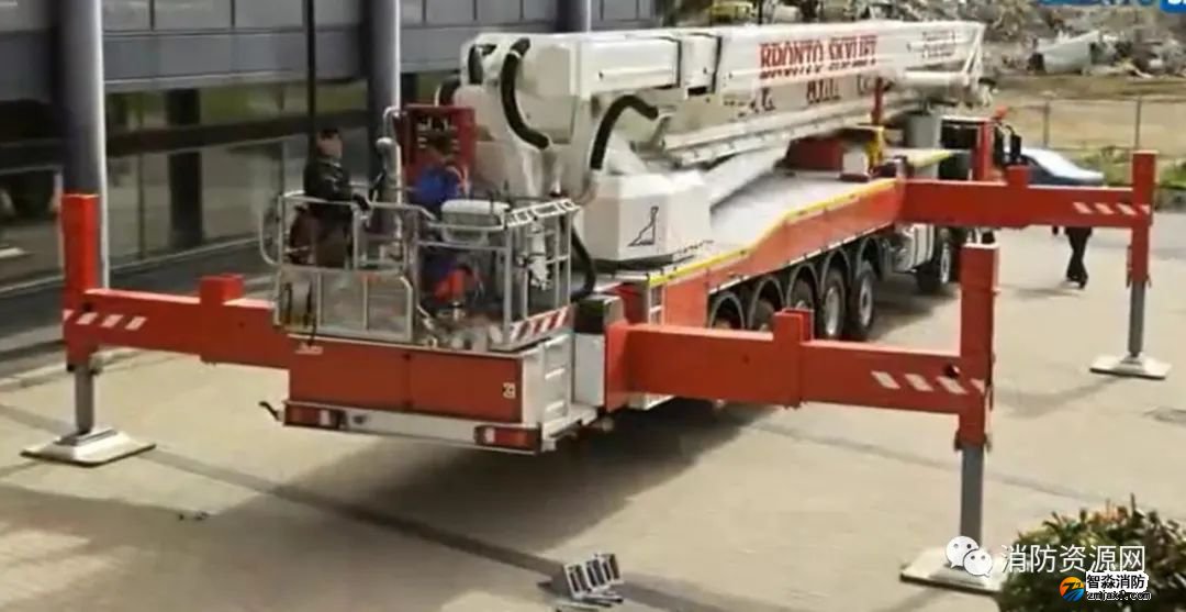 舉高車工作時(shí),通過支腿支撐,支腿通過支承墊板作用在登高場地上,消防車輪胎并不受力(懸空)。