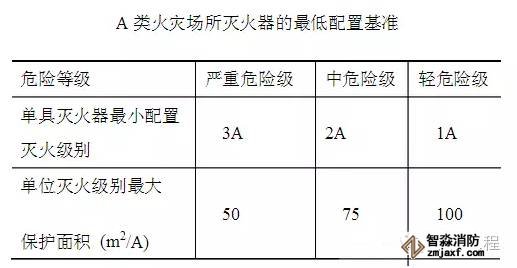 新規(guī)范規(guī)定的A類火災(zāi)場所滅火器的最低配置基準(zhǔn)規(guī)定:單具滅火器最小配置滅火級別為: 嚴(yán)重危險級為3A;中危險級為2A;輕危險級為1A;