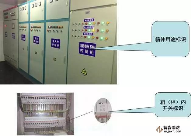 箱(柜)體標(biāo)識(shí)采用自噴漆噴涂或用不干膠紙粘貼方式進(jìn)行標(biāo)識(shí),字體寬度為40~45mm左右,內(nèi)容應(yīng)反映箱(柜)用途;箱(柜)內(nèi)開(kāi)關(guān)采用背膠紙打印粘貼在空開(kāi)上,應(yīng)反映控制對(duì)象的名稱;系統(tǒng)圖采用背膠紙打印,粘貼在箱(柜)門(mén)內(nèi)側(cè)合適位置,宜采用A4紙規(guī)格尺寸。