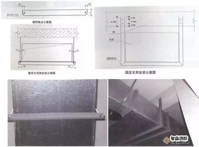 2、風(fēng)管穿越防火分區(qū)做法:用2mm厚鋼板加工制作風(fēng)管套管,套管接縫應(yīng)滿焊,套管尺寸比風(fēng)管四周尺寸大30~50mm,套管長(zhǎng)度與墻面厚度一致。安裝完后用防火材料將套管與風(fēng)管間隙填塞密實(shí)。用2mm厚、30~50mm寬黑色橡膠裝飾圈收口,裝飾圈角部45°拼接。風(fēng)管穿越防火分區(qū)處必須設(shè)防火閥,防火閥距墻分隔墻間距不大于200mm,風(fēng)管長(zhǎng)邊大于630mm時(shí),宜在防火閥兩側(cè)設(shè)單支吊架。