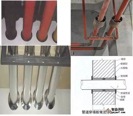 當(dāng)管道穿過(guò)防火堤、防火墻、樓板時(shí),應(yīng)安裝套管。穿防火堤和防火墻的套管長(zhǎng)度不應(yīng)小于防火堤和防火墻的厚度,穿樓板套管長(zhǎng)度應(yīng)高出樓板50mm,底部與樓板底面相平;管道與套管間的空隙應(yīng)采用防火材料封堵。