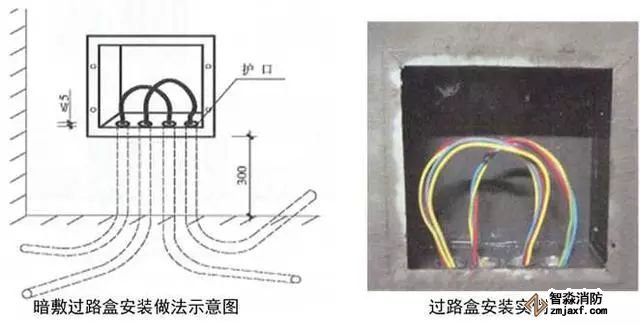 1、過(guò)路接線盒:在導(dǎo)管敷設(shè)時(shí),按照規(guī)范要求在適當(dāng)位置設(shè)置過(guò)路接線盒。過(guò)路盒安裝時(shí)距地高度宜為300mm;在結(jié)構(gòu)板內(nèi)安裝過(guò)路盒時(shí),應(yīng)用扎絲綁緊,盒內(nèi)填充密實(shí),表面用膠帶密封;導(dǎo)管應(yīng)垂直進(jìn)入線盒,焊接管絲頭伸入線盒內(nèi)長(zhǎng)度不大于5mm,盒子內(nèi)外鋼管鎖母上緊,(或KBG、JDG管可用盒接頭與過(guò)路接線盒連接)接地,用φ6圓鋼在焊管間、焊管與過(guò)路盒間進(jìn)行接地跨接;盒內(nèi)穿線應(yīng)留有適當(dāng)余量;管口加護(hù)口;安裝過(guò)路盒面板,面板緊貼墻面或頂面。