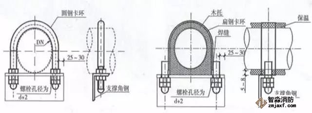 選擇與管徑匹配的卡環(huán),卡環(huán)安裝固定螺栓孔應(yīng)保證管道順直且居卡環(huán)中間,卡環(huán)與管道應(yīng)接觸緊密。圓鋼卡環(huán)與不銹鋼管、銅管連接固定時(shí),卡環(huán)應(yīng)套塑料保護(hù)軟管,管道與支架間接觸面應(yīng)墊與角鋼同寬的隔離橡膠墊。扁鋼卡環(huán)應(yīng)與木托同寬,與螺栓應(yīng)滿焊連接;在與支架連接處應(yīng)垂直,扁鋼端部與支架宜留有5~8mm收縮余量,卡環(huán)端部外露支架的螺栓宜采用圓頭螺帽收頭,油漆涂刷應(yīng)均勻。