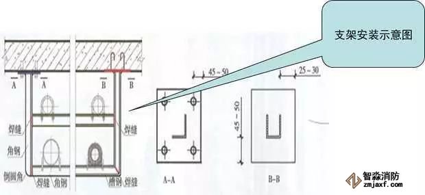 2)、固定支架宜設(shè)在主梁和次梁上,其設(shè)置方向應(yīng)同于其他支架。固定支架伸入梁的長(zhǎng)度不宜小于200mm,固定點(diǎn)每側(cè)不少于兩個(gè),上部固定點(diǎn)距支架頂端不宜小于50mm,底部固定點(diǎn)距梁底端不宜小于50mm,固定點(diǎn)間距不宜小于100mm,所有型鋼支架尖角必須倒成圓弧角。