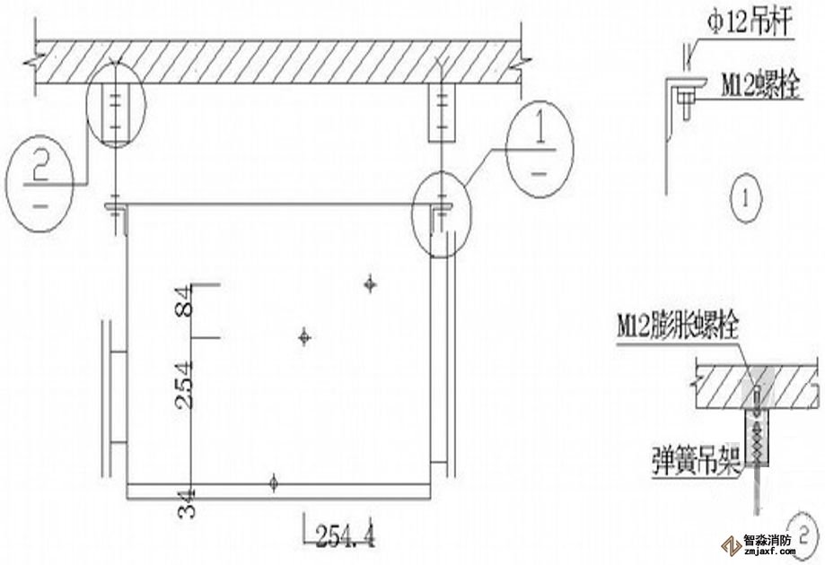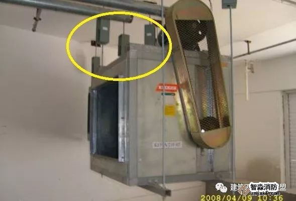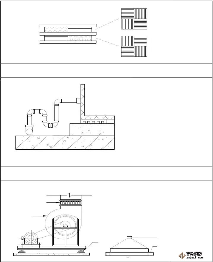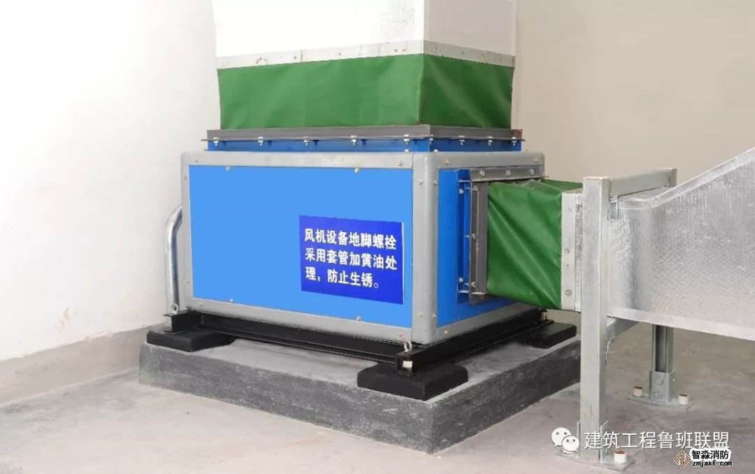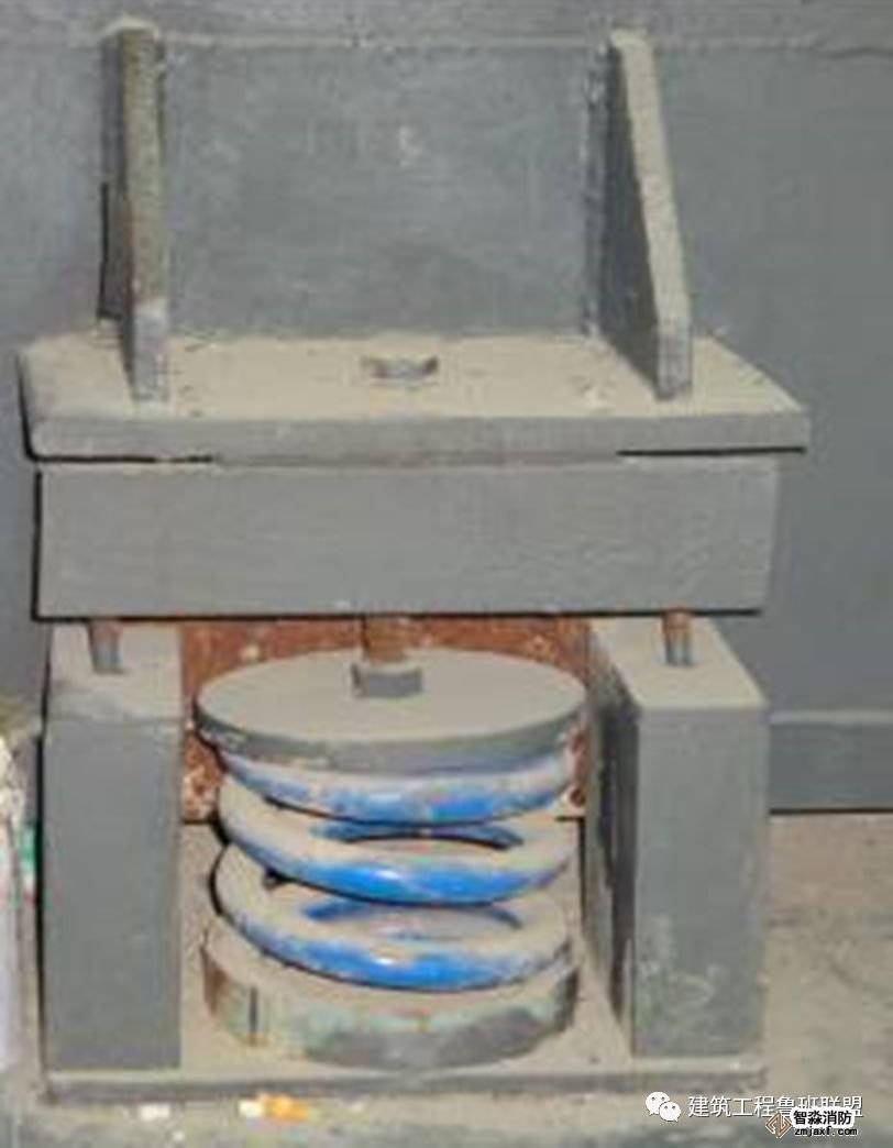 為防止軸流風(fēng)機(jī)工作時(shí)擺動(dòng),用槽鋼做成框架固定在樓板上,圖為排風(fēng)兼排煙風(fēng)機(jī)下部設(shè)置阻尼彈簧減震器
