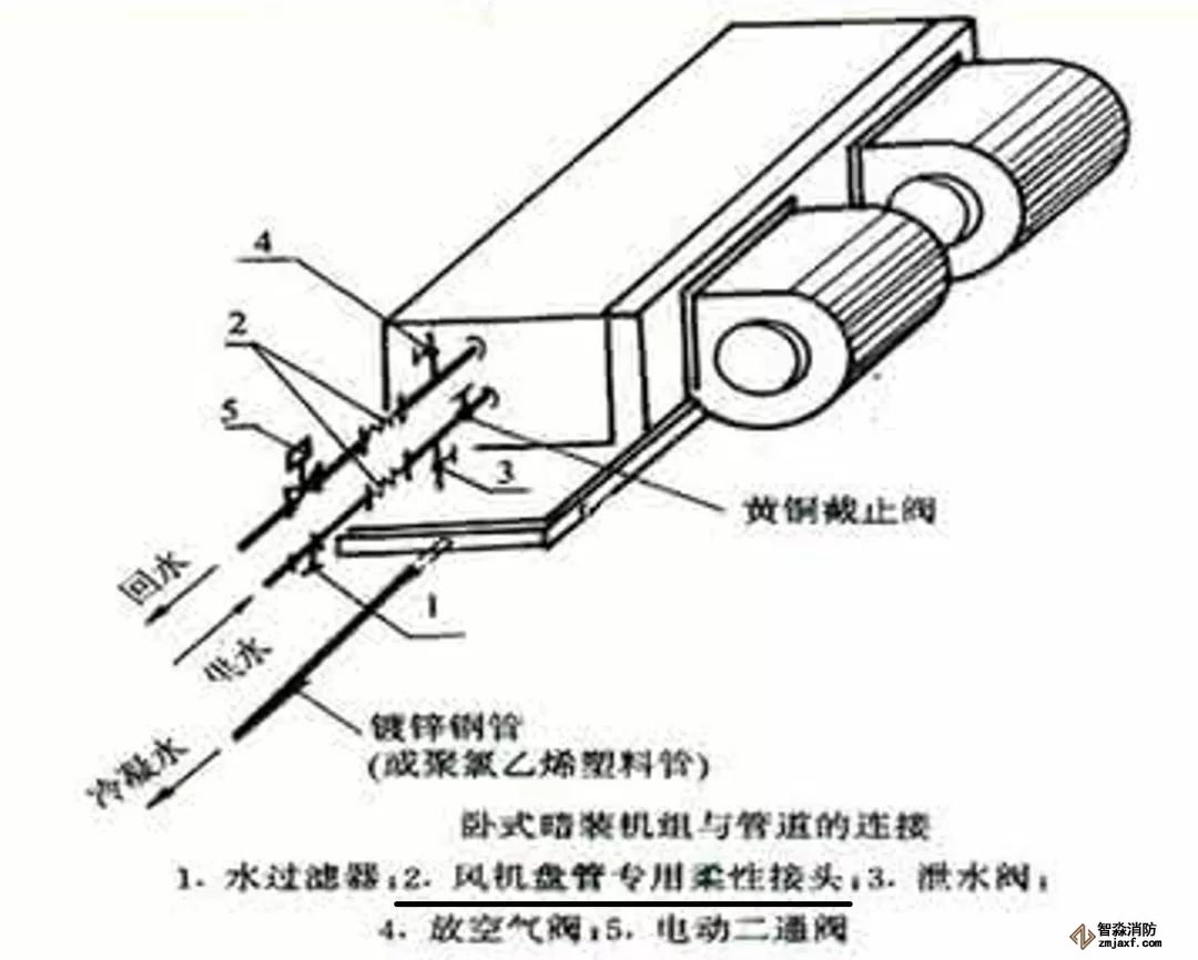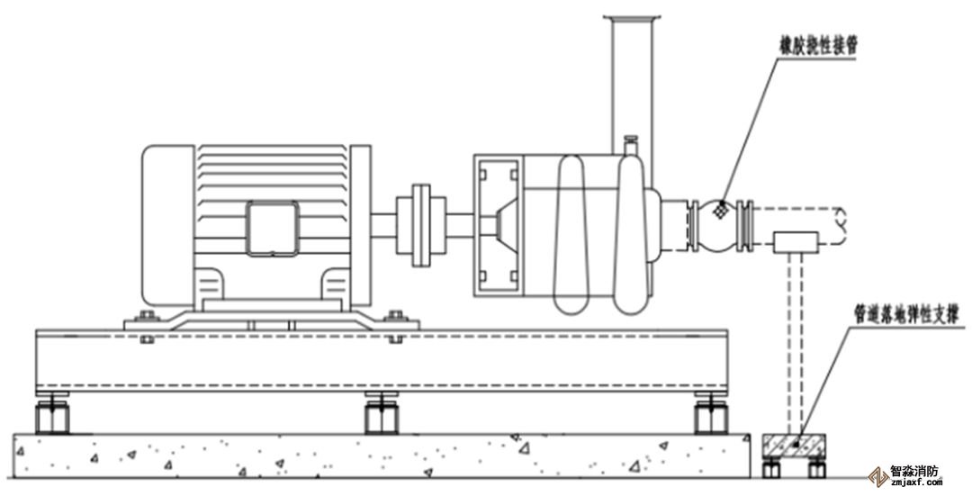 冷水機(jī)組底座設(shè)置彈簧減震器,落地支架應(yīng)安裝在柔性短管的后側(cè)