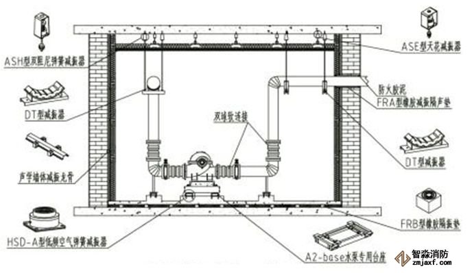 3. 在管路的支吊架、穿墻處使用非燃軟性材料填充做減振處理。