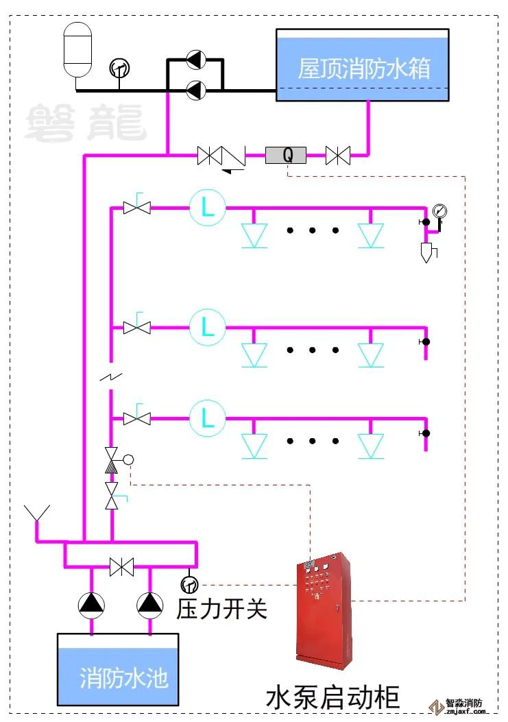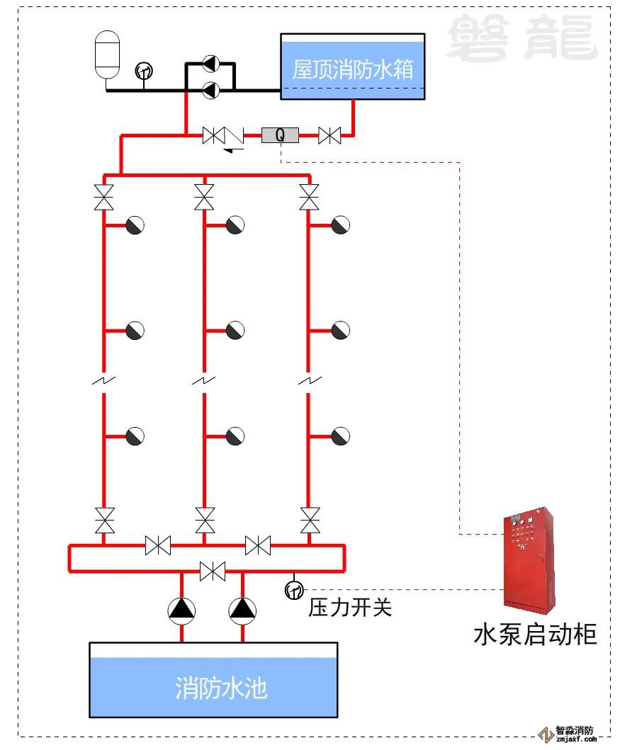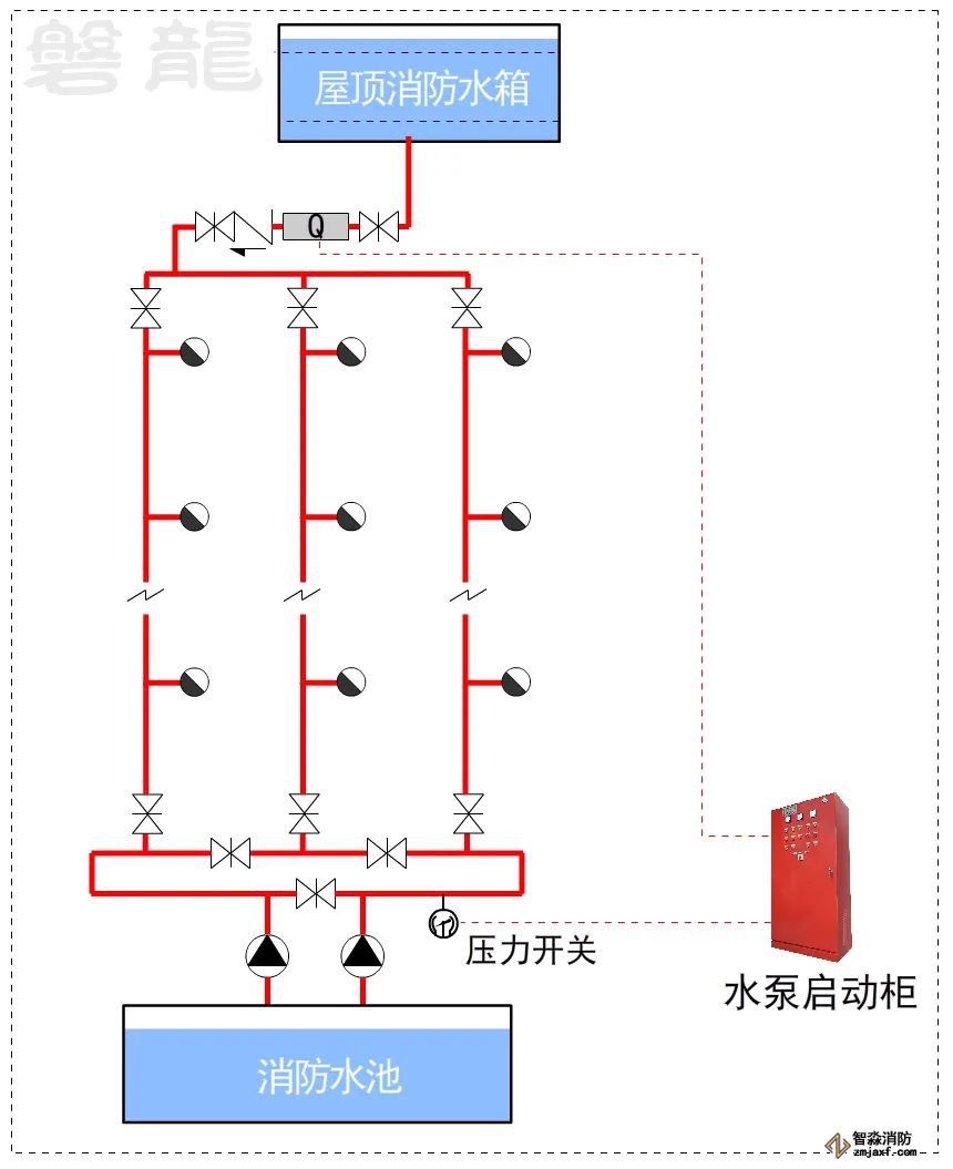 對(duì)于這類(lèi)系統(tǒng),消防水泵出水干管上應(yīng)設(shè)置壓力開(kāi)關(guān),高位消防水箱出水管上應(yīng)設(shè)置流量開(kāi)關(guān),存在問(wèn)題及解決措施: