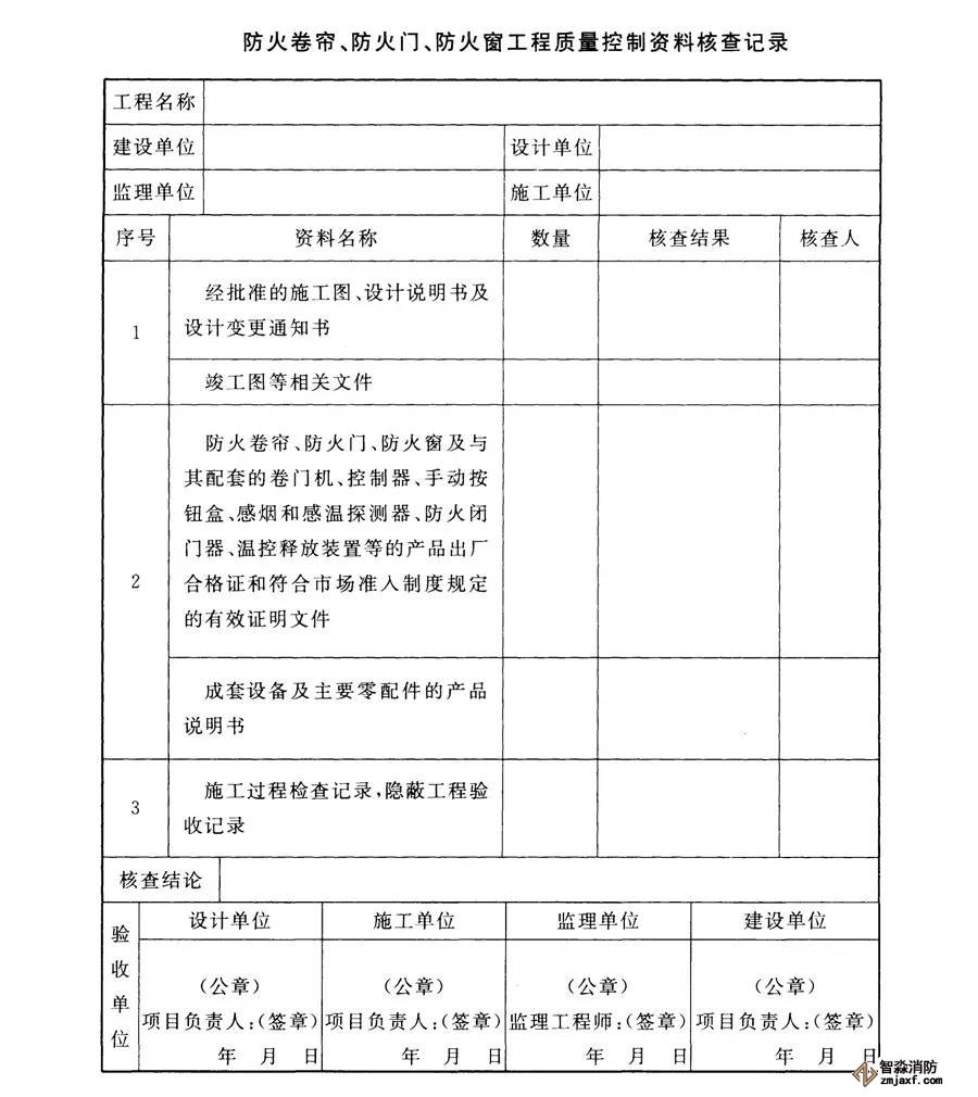 2、防火卷簾、防火門、防火窗工程質(zhì)量驗收前,施工單位應(yīng)提供下列文件資料,并應(yīng)按下表填寫資料核查記錄: