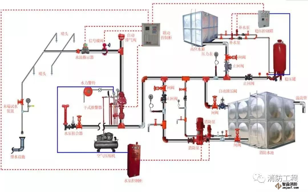 干式系統(tǒng)在準工作狀態(tài)時管道內充滿用于啟動系統(tǒng)的有壓氣體的閉式系統(tǒng),干式系統(tǒng)由閉式噴頭、干式報警閥組、充氣設備、水流指示器或壓力開關,供水設施及供水配水管道等組成。