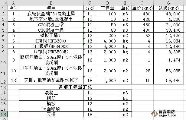 請(qǐng)注意,需要將各項(xiàng)工程量進(jìn)行分類(如11、12……)。筆者再解釋下單元格D14的公式“=SUMIF($C$2:$C$12,C14,$D$2:$D$12)”:第一個(gè)參數(shù)“$C$2:$C$12”和第三個(gè)參數(shù)”$D$2:$D$12“必須保持單元格行數(shù)對(duì)應(yīng)。比如本案例中"分類"列的起始行數(shù)為2,"工程量"列的起始行數(shù)也必須為2。同樣,"分類"列的結(jié)束行數(shù)為12,"工程量"列的結(jié)束行數(shù)也必須為12。另外,這兩個(gè)參數(shù)必須用”$”鎖定單元格,這么做是為了方便后期批量復(fù)制單元格的時(shí)候分類匯總數(shù)據(jù)不會(huì)隨粘貼單元格位置的不同而變化。