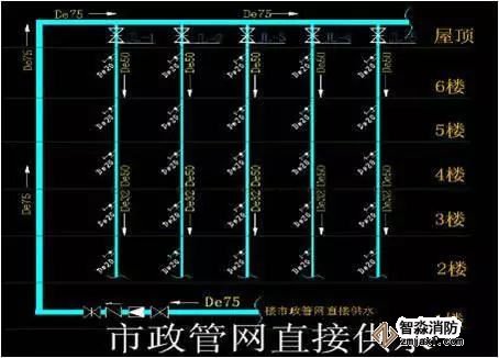 當市政供水管網(wǎng)接入到分店屋頂(或最高樓層,管徑De90以上),出水口的壓力能夠長期穩(wěn)定在0.15MPa以上時,則可采取此種方式直接供水。