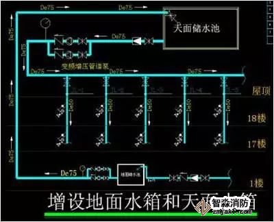 當市政管網(wǎng)的供水壓力夠大(能夠到達最高樓層)但是管徑偏?。ㄐ∮贒e50)時,則可在樓頂增設屋頂冷水箱,市政管網(wǎng)接入屋頂冷水箱進行蓄水,在供水的主管道上安裝增壓水泵和變頻控制器,壓力控制以滿足最高樓層的供水壓力不小0.15MPa為準。