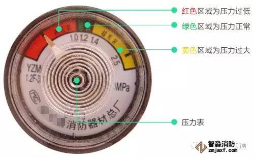 2、儲(chǔ)壓式滅火器壓力符合要求,壓力表指針在綠區(qū);