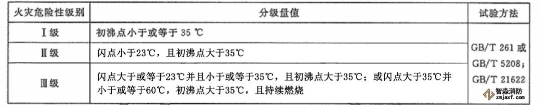 易燃液體火災危險性分級方法見下表: