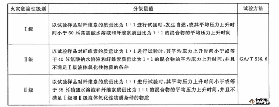 固體氧化性物質火災危險性分級方法見下表: