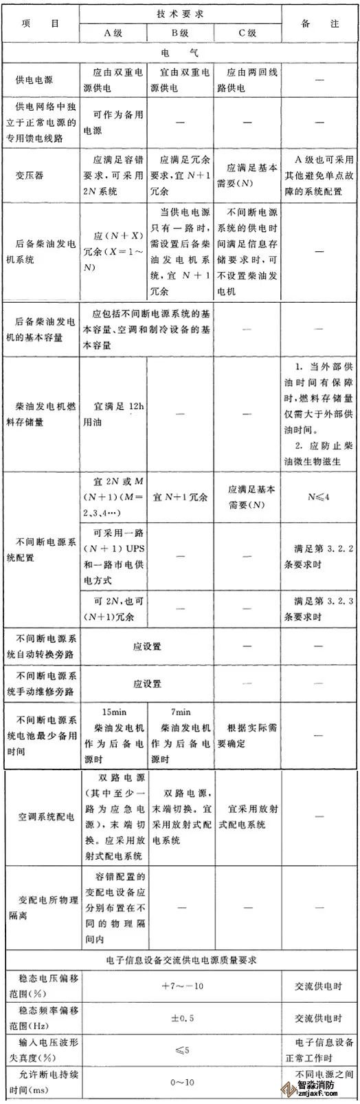 1、數(shù)據(jù)中心用電負(fù)荷等級(jí)及供電要求應(yīng)根據(jù)數(shù)據(jù)中心的等級(jí),按下表技術(shù)要求執(zhí)行,并應(yīng)符合現(xiàn)行國(guó)家標(biāo)準(zhǔn)《供配電系統(tǒng)設(shè)計(jì)規(guī)范》GB 50052的有關(guān)規(guī)定。