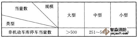 注1:對于非機(jī)動車庫來講,主要考慮以自行車作為主要停駛車輛,因此以自行車為標(biāo)準(zhǔn)當(dāng)量作為劃分依據(jù),其他類型非機(jī)動車輛如三輪車、電動自行車、機(jī)動輪椅車等停放在庫中時應(yīng)按相應(yīng)當(dāng)量換算系數(shù)進(jìn)行折算。