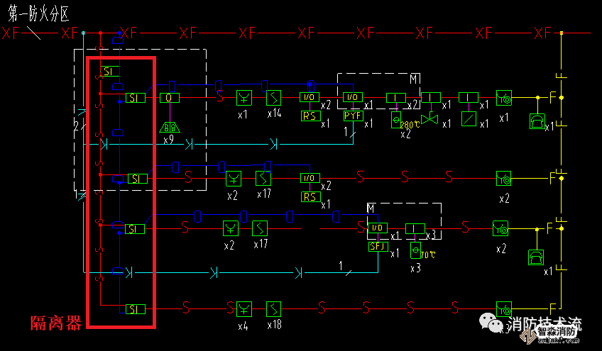 在總線制火災(zāi)自動(dòng)報(bào)警系統(tǒng)中,因各種原因有時(shí)會(huì)出現(xiàn)某一局部總線出現(xiàn)故障(例如短路),可能會(huì)造成整個(gè)報(bào)警系統(tǒng)全線癱瘓的情況。而使用隔離器串入總線的各段或串入主線與支線的交界處,一旦出現(xiàn)總線回路某處短路,隔離器就會(huì)將發(fā)生故障的總線部分與整個(gè)系統(tǒng)隔離開(kāi)來(lái),以保證系統(tǒng)的其它部分能夠正常工作。