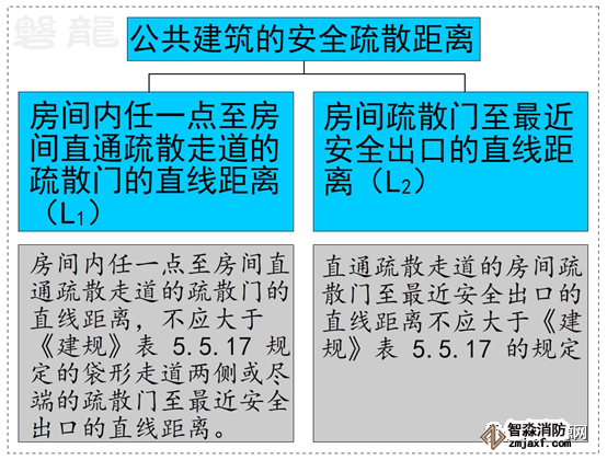 因此,規(guī)范圖示沒有明示疏散走道盡端到安全出口的距離要求,通常情況下,僅需控制好疏散門到安全出口的距離即可。