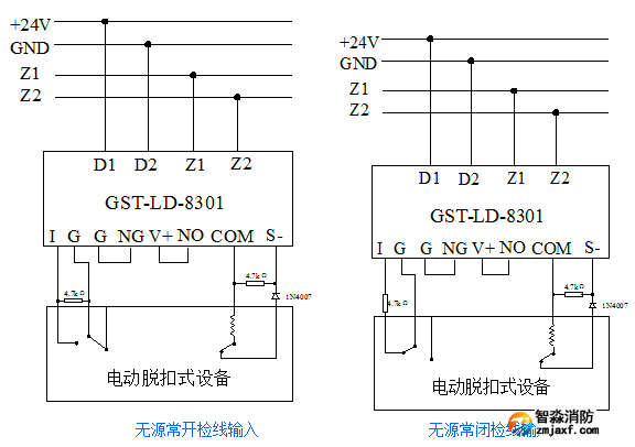 Z1、Z2:接火災(zāi)報(bào)警控制器信號二總線,無極性