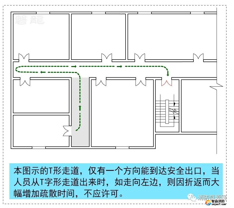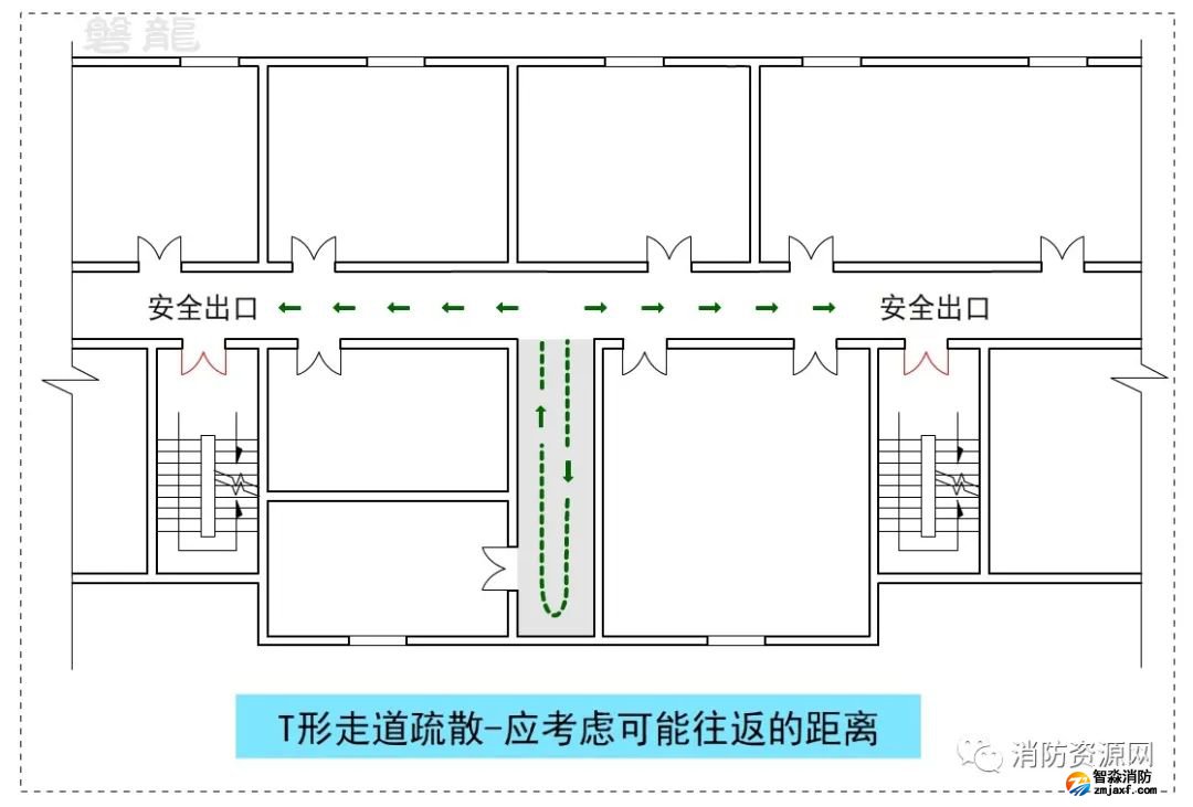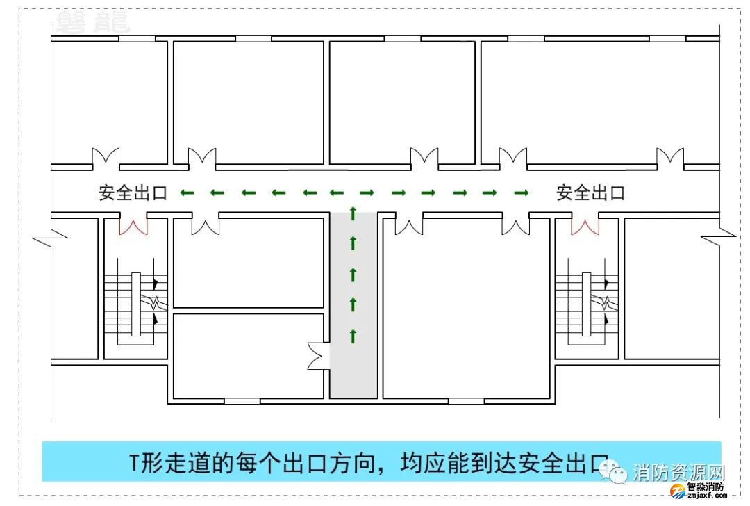 T形走道也稱為丁字形走道,是消防安全疏散設計中不可回避的形式,關于T形疏散走道的疏散距離計算,參專題:T形走道-宜與忌!疏散距離計算規(guī)則!