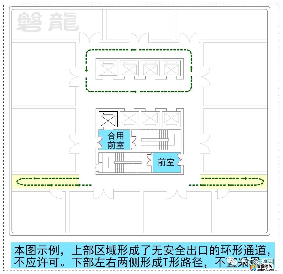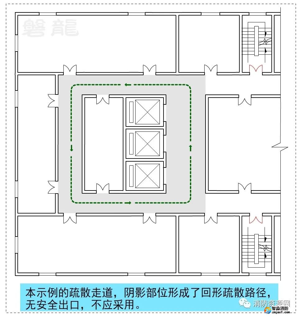 1、圖示9、圖示10所示的疏散走道,示例部位形成環(huán)形疏散路徑,沒有安全出口,不應采用。