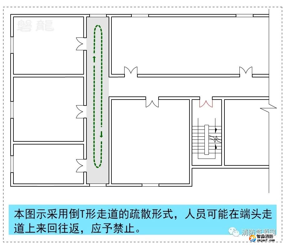 圖示6中,出現(xiàn)了倒T形走道的疏散形式,人員可能在端頭的走道上來回往返,應予禁止。