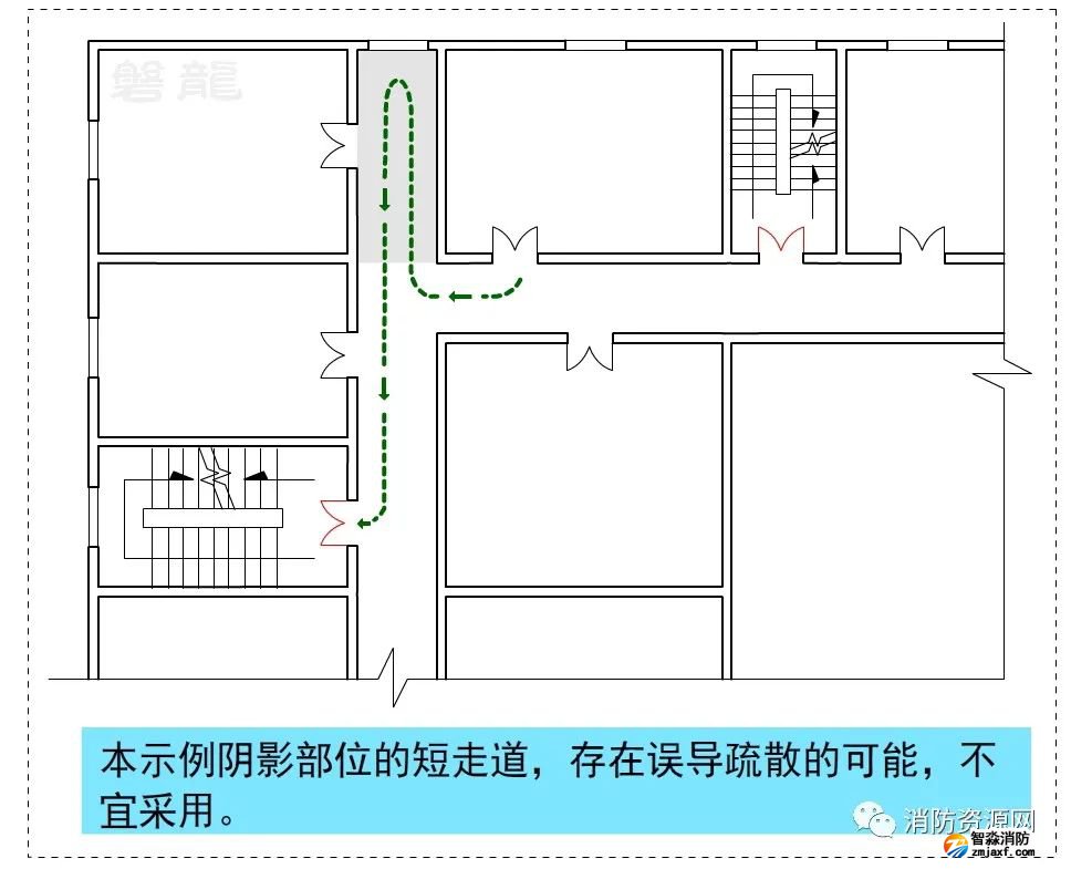 圖示7類似的疏散走道,陰影部位的短走道,存在誤導疏散的可能,不宜采用。確需采用時,應按直線方向行走的疏散習慣,嚴格復核疏散距離。