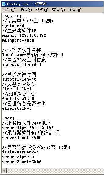 serverlevel=0 //設(shè)置服務(wù)器的級別,當此值設(shè)置0時,服務(wù)器以主工作方式,投入接警運行狀態(tài),當此值為1時,工作在備份模式,此時不處理接警。