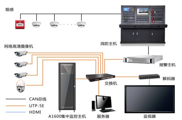 本聯(lián)動系統(tǒng)主要由火災(zāi)自動報警系統(tǒng)、報警主機服務(wù)器、視頻監(jiān)控系統(tǒng)組成。