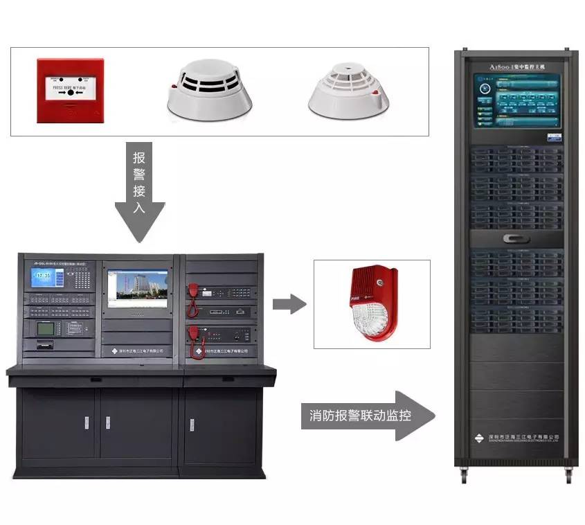 2、當(dāng)報警情況發(fā)生時,信號反饋傳入監(jiān)控室的消防主機,驅(qū)動聲光報警器進行警告提醒,同時聯(lián)動通知視頻監(jiān)控主機;(如下圖所示)