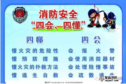 四會(huì):會(huì)報(bào)警;會(huì)撲救初期火災(zāi);會(huì)組織疏散逃生;會(huì)使用消防器材。
