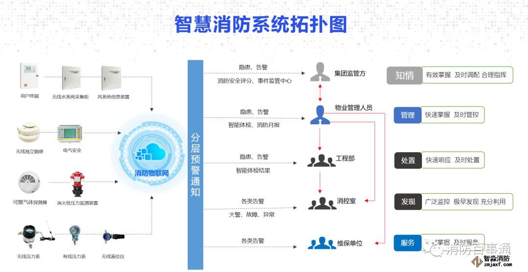 在養(yǎng)老機(jī)構(gòu)消防控制室的火災(zāi)自動(dòng)報(bào)警主機(jī)上加裝用戶(hù)信息傳輸裝置,一旦有消防設(shè)施報(bào)警或固定消防設(shè)施損壞等情況,系統(tǒng)自動(dòng)推送報(bào)警信息到安保負(fù)責(zé)人或部門(mén)負(fù)責(zé)人的手機(jī)和電腦端,從而保證火災(zāi)隱患能及時(shí)發(fā)現(xiàn)、處置,保證固定消防設(shè)施完好率,同時(shí)避免因值班人員脫崗、睡崗、離崗而無(wú)法收到警情信息的問(wèn)題。