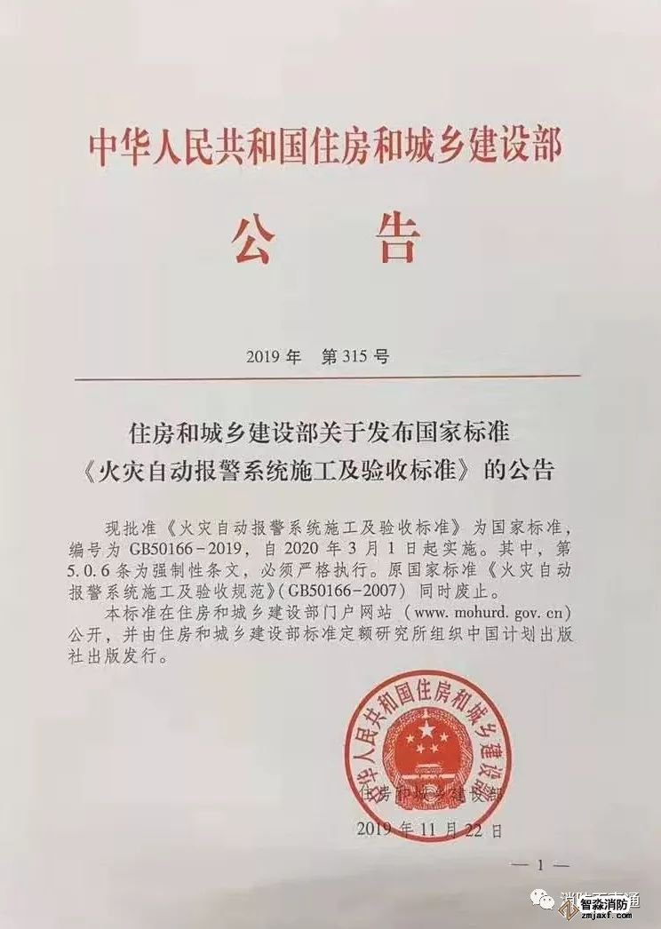 現(xiàn)批準《火災(zāi)自動報警系統(tǒng)施工及驗收標準》為國家標準,編號為GB50166-2019,自2020年3月1日起實施。其中,第5.0.6條為強制性條文,必須嚴格執(zhí)行。原國家標準《火災(zāi)自動報警系統(tǒng)施工及驗收規(guī)范》(GB50166-2007)同時廢止。