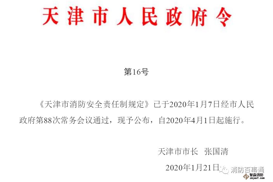 1月7日,天津市消防救援總隊(duì)聯(lián)合市應(yīng)急局起草的《天津市消防安全責(zé)任制規(guī)定》經(jīng)天津市人民政府第88次常務(wù)會(huì)議審議,1月21日,市長張國清簽發(fā)第16號(hào)市政府令予以公布。