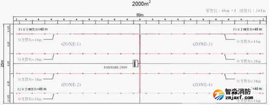 下圖是防火分區(qū)2000m2,使用FANFARE-2000探測主機(jī),分為4個探測區(qū)域(每區(qū)500m2),采樣孔保護(hù)面積25.2m2的管路設(shè)計圖