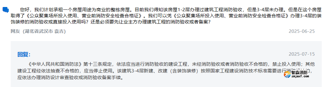 咨詢(xún):您好,我們計(jì)劃承租一個(gè)房屋用途為商業(yè)的整棟房屋。目前我們得知該房屋1-2層辦理過(guò)建筑工程消防驗(yàn)收,但是3-4層未辦理。但是在這個(gè)房屋取得了《公眾聚集場(chǎng)所投入使用、營(yíng)業(yè)前消防安全檢查合格證》。我們可以憑《公眾聚集場(chǎng)所投入使用、營(yíng)業(yè)前消防安全檢查合格證》辦理3-4層的裝飾裝修的消防驗(yàn)收或直接投入使用嗎?還是必須要先讓業(yè)主方辦理建筑工程的消防驗(yàn)收或者備案?