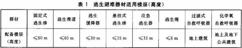 (1)逃生滑道、固定式逃生梯應配備在不高于60m的樓層內(nèi);逃生緩降器應配備在不高于30m的樓層內(nèi);懸掛式逃生梯、應急逃生器應配備在不高于15m的樓層內(nèi);逃生繩應配備在不高于6m的樓層內(nèi)。地上建筑可配備過濾式自救呼吸器或化學氧自救呼吸器,高于30m的樓層內(nèi)應配備防護時間不少于20min的自救呼吸器。地下建筑應配備化學氧自救呼吸器。逃生避難器材配備樓層(高度)見下表。