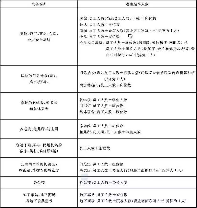 (2)各類場所的逃生避難人數(shù)及逃生避難器材可救助人數(shù)的計算方法參見下表。