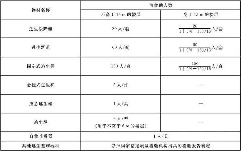 (1)逃生避難器材的配備數(shù)量應滿足器材可救助人數(shù)之和不小于逃生避難人數(shù)的要求。