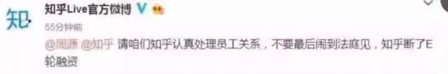 9日,知乎Live官方發(fā)微博稱,“請知乎認(rèn)真處理員工關(guān)系,不要最后鬧到法庭見,知乎斷了E輪融資”,并艾特了知乎創(chuàng)始人周源。據(jù)此前該賬號發(fā)布的消息顯示,該離職員工投訴對象為其直接領(lǐng)導(dǎo)孟珊。該員工稱,孟珊在知乎帶領(lǐng)只是市場Live微信生態(tài)期間,管理霸蠻,工作安排不公平。知乎方面表示,是知乎離職員工盜取了官方微博賬號密碼發(fā)送了該則消息。目前,該賬號發(fā)布的相關(guān)內(nèi)容已被刪除。